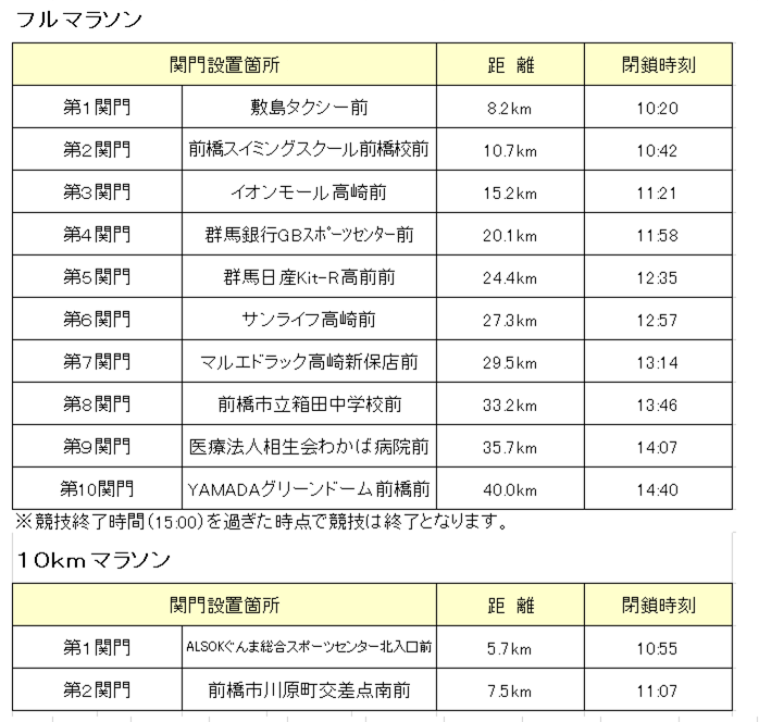 フルマラソン、10kmマラソンで実施される関門の閉鎖時刻が決定しました。