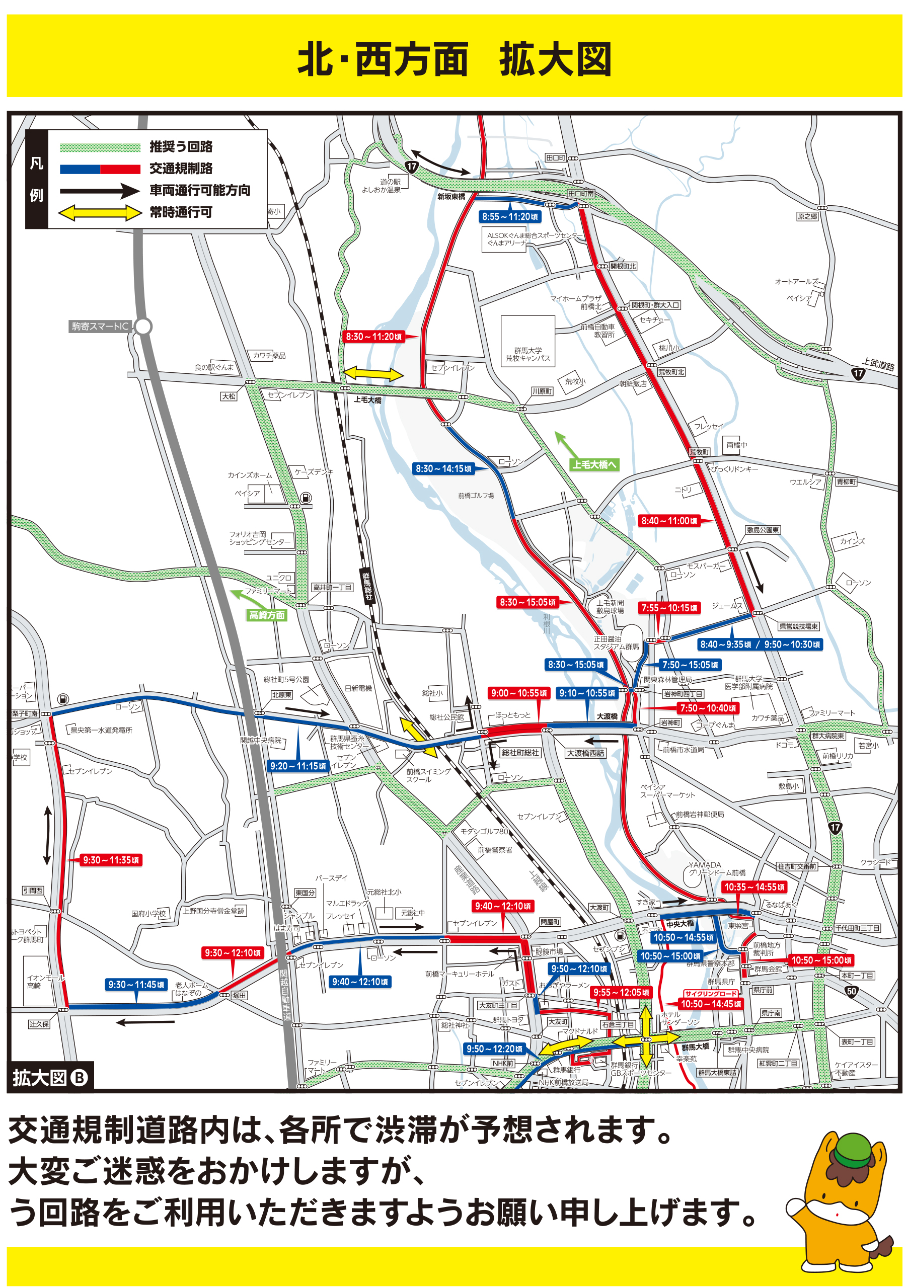 大会当日、前橋市・高崎市でランナーの通過に合わせて交通規制を行う予定です。 沿線や周辺道路は混雑が予想されますので、ご理解とご協力をお願いいたします。