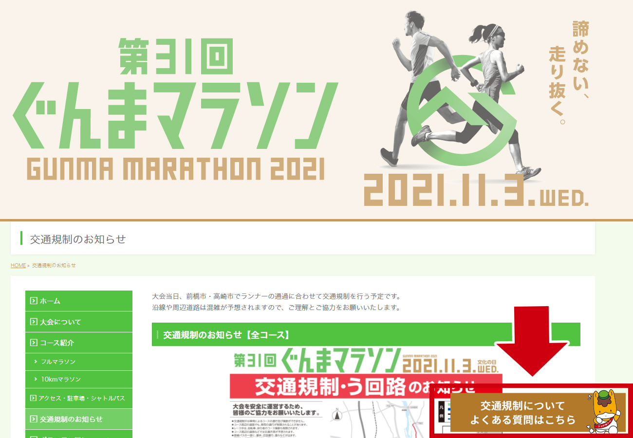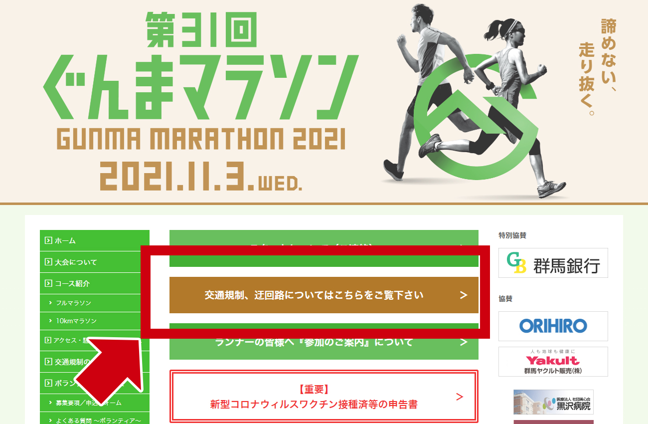 - ぐんまマラソンホームページのトップページに掲載されている「交通規制、迂回路についてはこちらをご覧下さい」(赤い四角で囲まれた部分)をクリックします。
