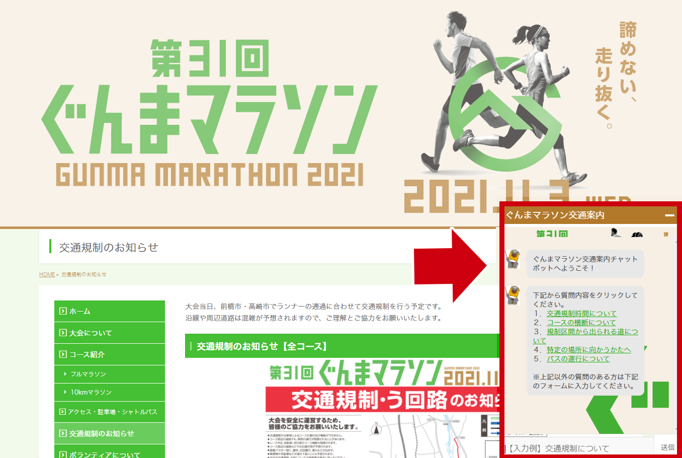 交通規制案内のチャットボット(自動応答システム)をぐんまマラソンホームページ上に導入しました。